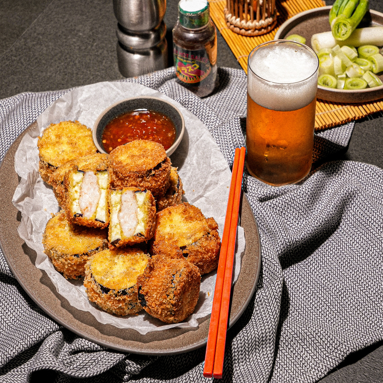 5. 150도 정도의 기름에 넣어 약 3분간 노릇하게 튀겨주면 가지 멘보샤 완성!