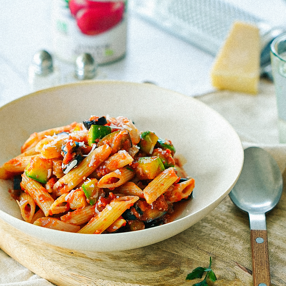 펜네 100g, 가지 1/3개, 애호박 1/3개, 양파 1/2개, 블랙올리브 8알, 이탈리안 파슬리 2줄기, 그라나파다노, 토마토 퓨레 300g, 다진마늘 1T, 맛스터 스파이시 2포, 맛스터 오리지널 1포, 설탕 2t, 올리브오일 1.5T