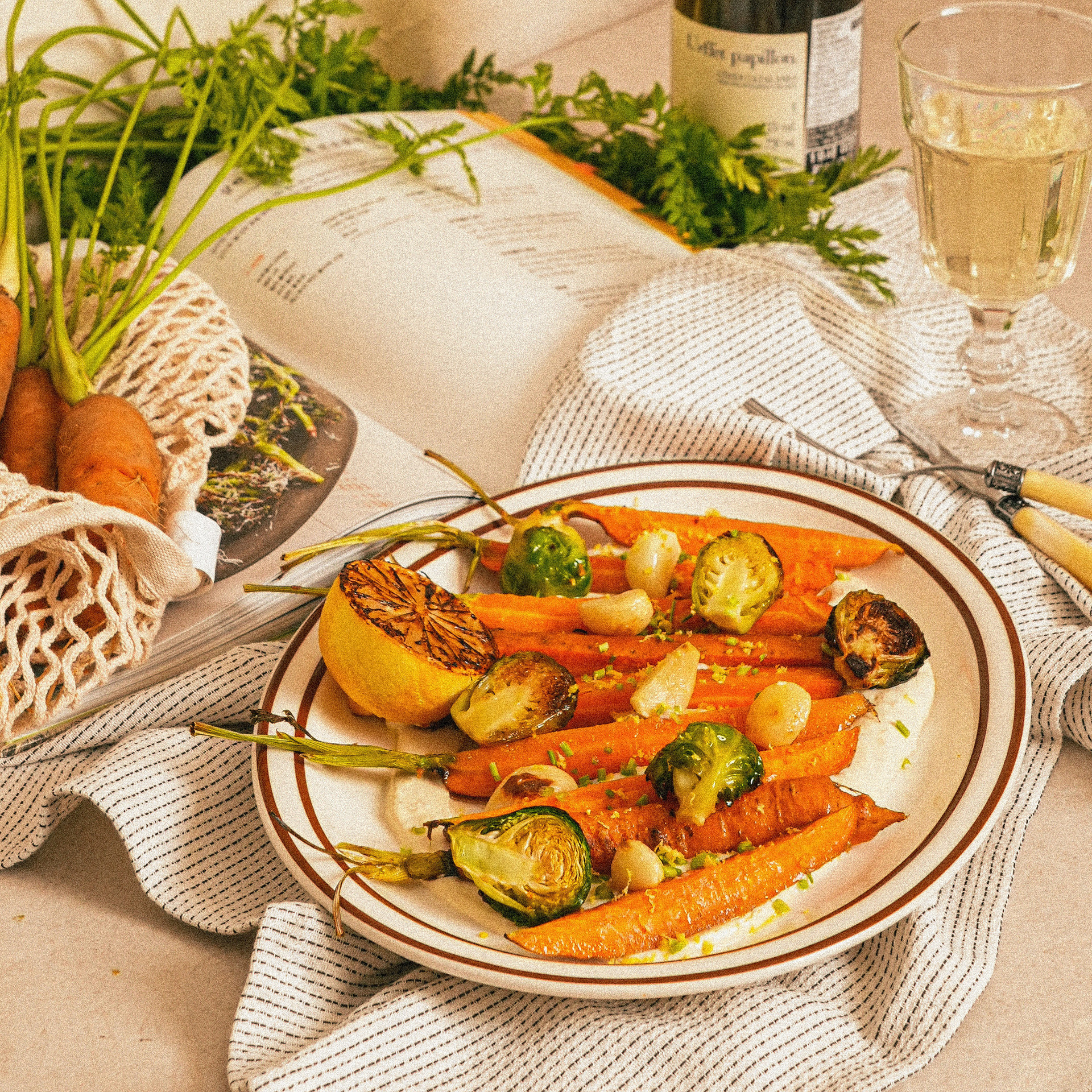 5. 접시에 두부 딥소스를 깔고 구운 당근과 채소를 올려 레몬 제스트를 뿌려 마무리해주면 완성!