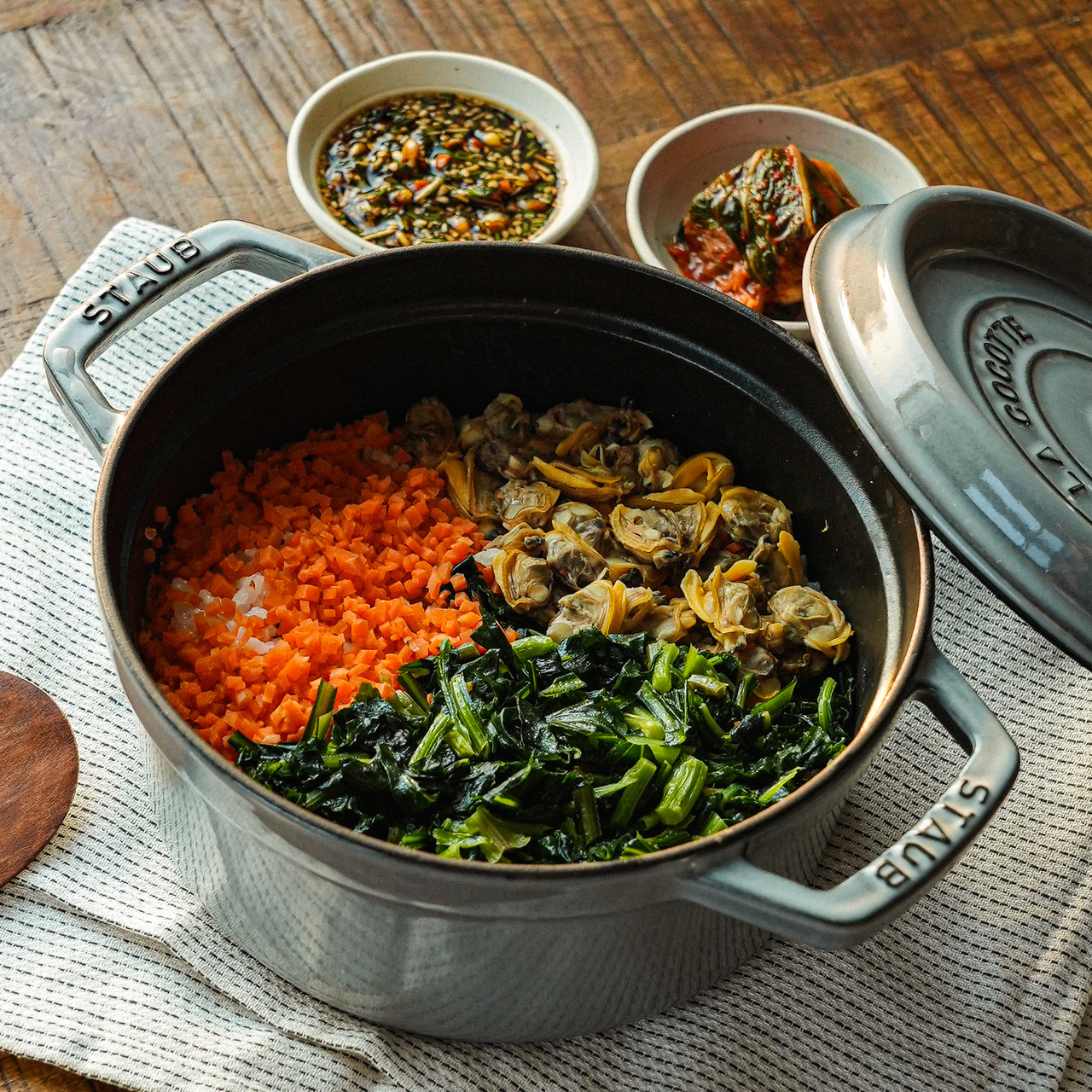 7. 솥밥 위에 바지락살을 발라주고, 잘 섞어주면 바지락 참취 솥밥 완성!