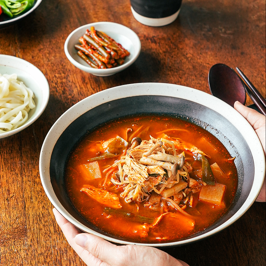 기호에 따라 칼국수면을 삶아 닭개장에 곁들여 보세요.