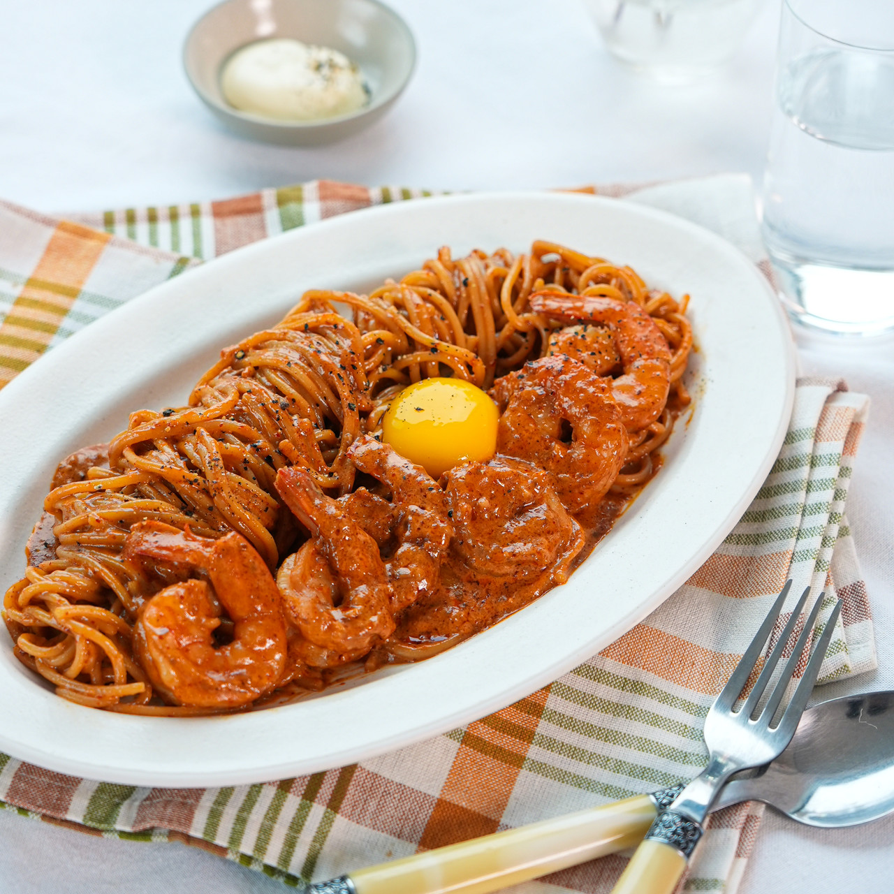 매콤한 파스타 위에 녹진한 계란 노른자를 올리면 부드러움과 고소함이 배가 됩니다.