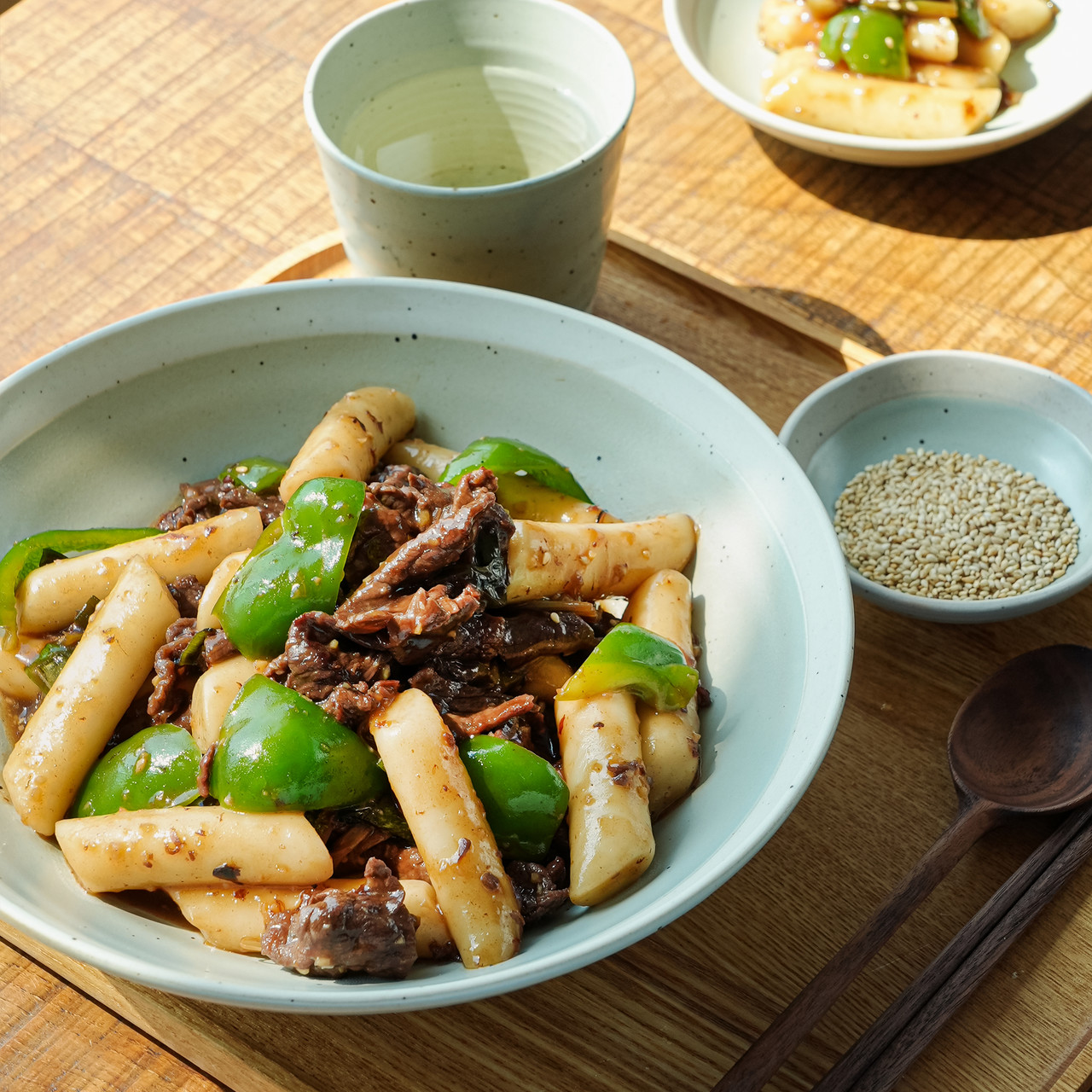 소고기 불고기용 200g, 쌀 떡볶이 500g, 대파 2대, 피망 1개, 소금 2꼬집, 식용유 1T, 다진 마늘 1T, 진간장 4T, 맛스터 오리지널 2포, 설탕 2T, 배음료 1캔(238ml), 물 100ml, 참기름 1T, 통깨
