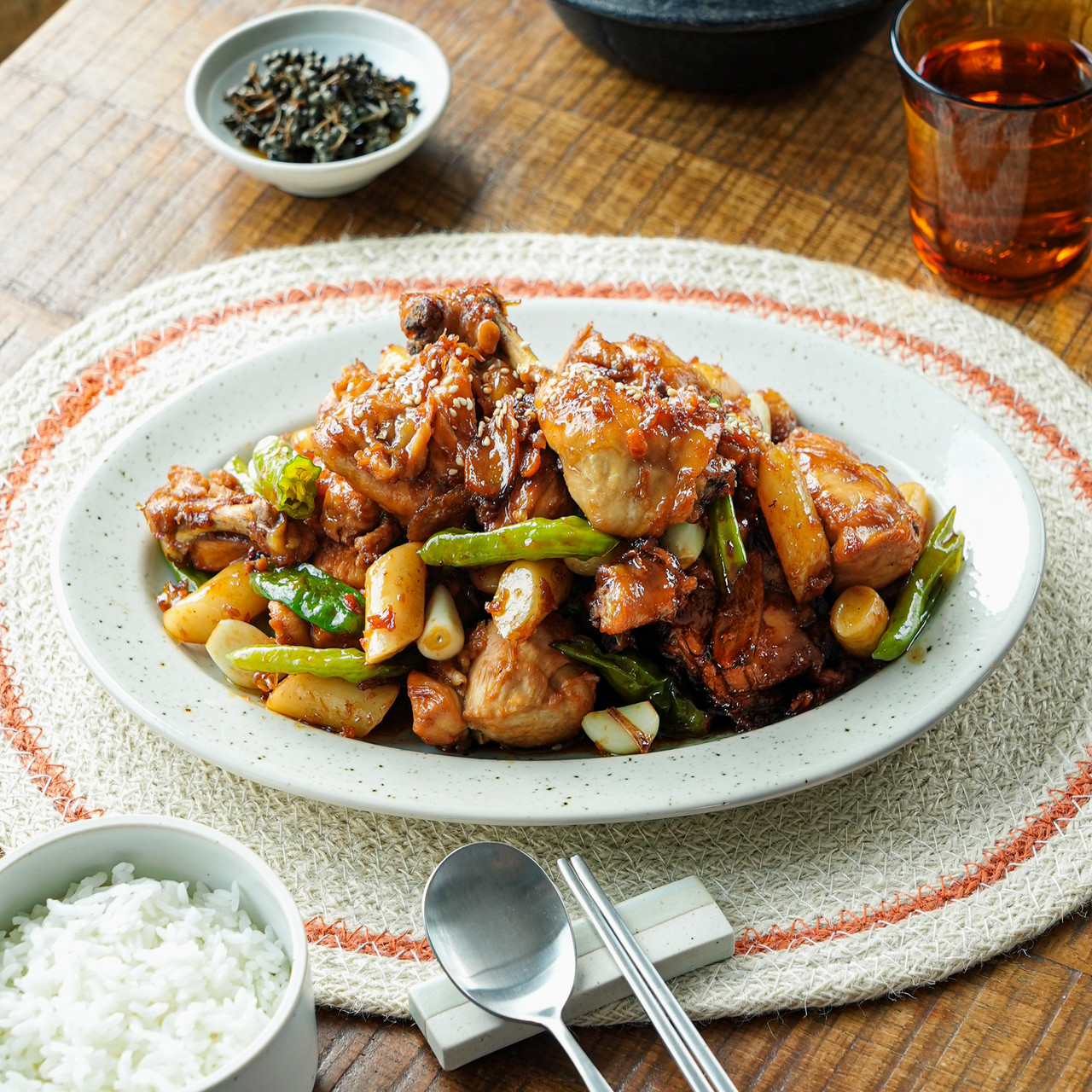 닭볶음탕용 닭 1kg, 꽈리고추 10개, 떡볶이 떡 6개, 마늘 12알, 생강 한톨, 맛스터 오리지널 1포, 설탕 1T, 양조간장 3T, 굴소스 1T, 물엿 6T, 통깨