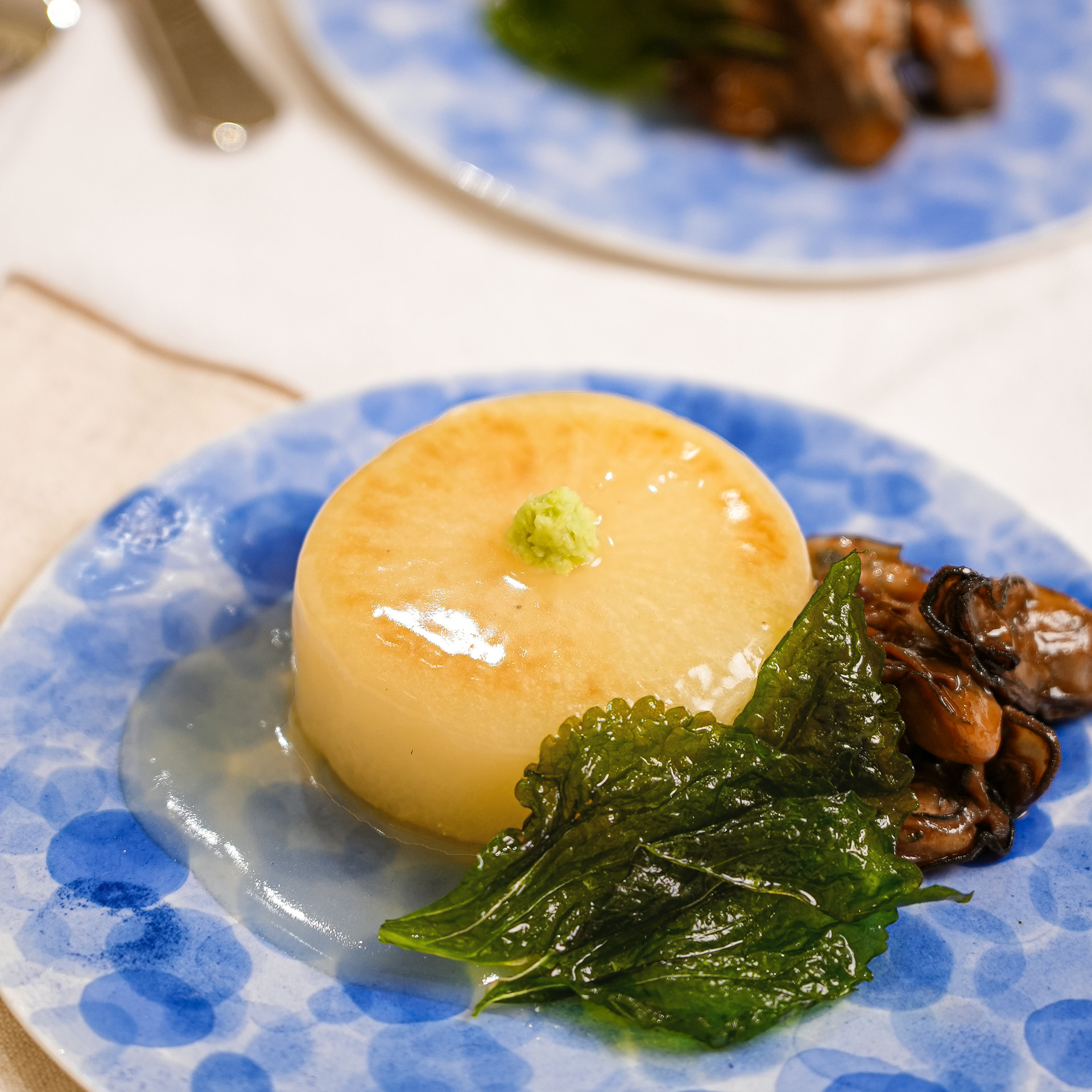 6. 들기름에 노릇하게 구운 무를 접시에 담고 굴과 소스를 올려준 뒤, 와사비를 곁들이면 완성!
