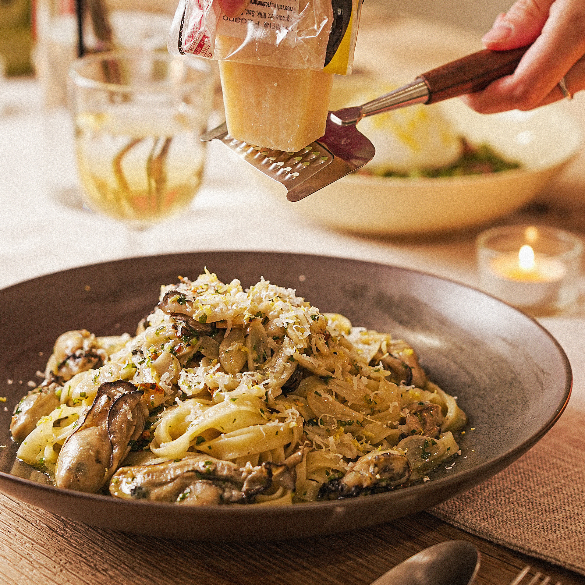 6. 파스타를 접시에 담고 마지막으로 파르미지아노 레지아노와 레몬 제스트를 뿌려 완성해 주세요.