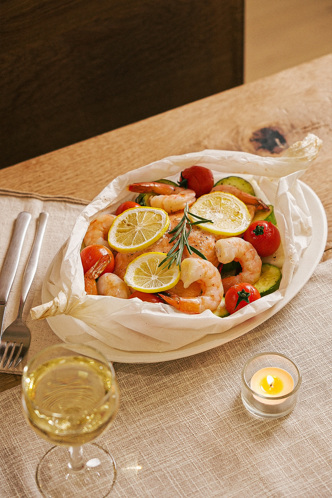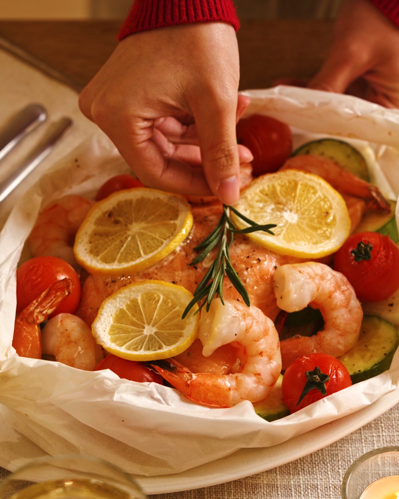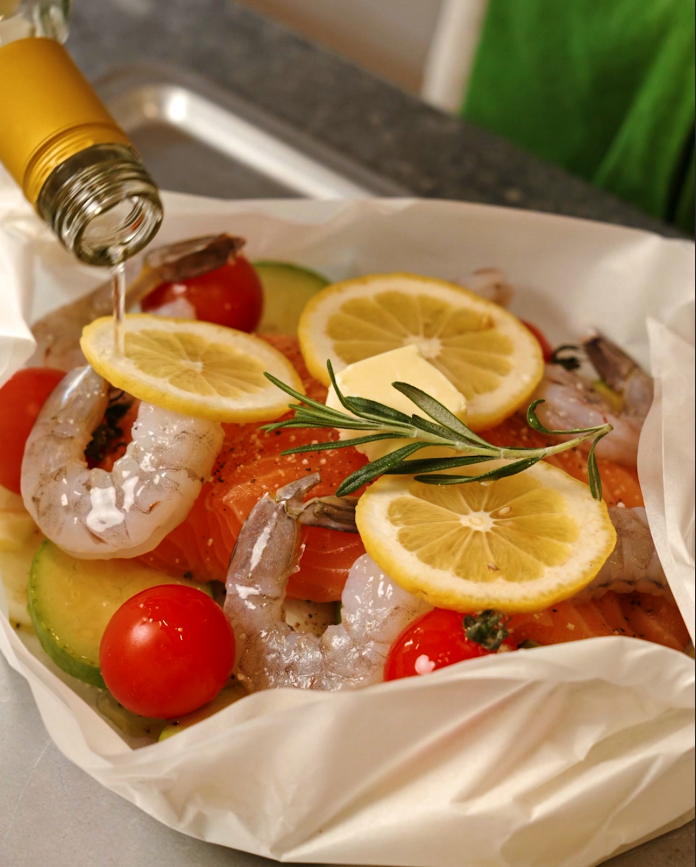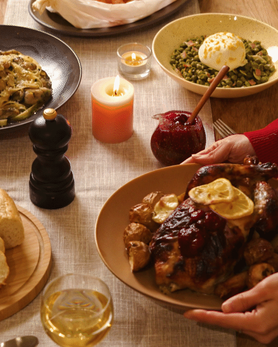 발라주고, 닭 속에 레몬과 로즈마리, 딜을 채워 다리를