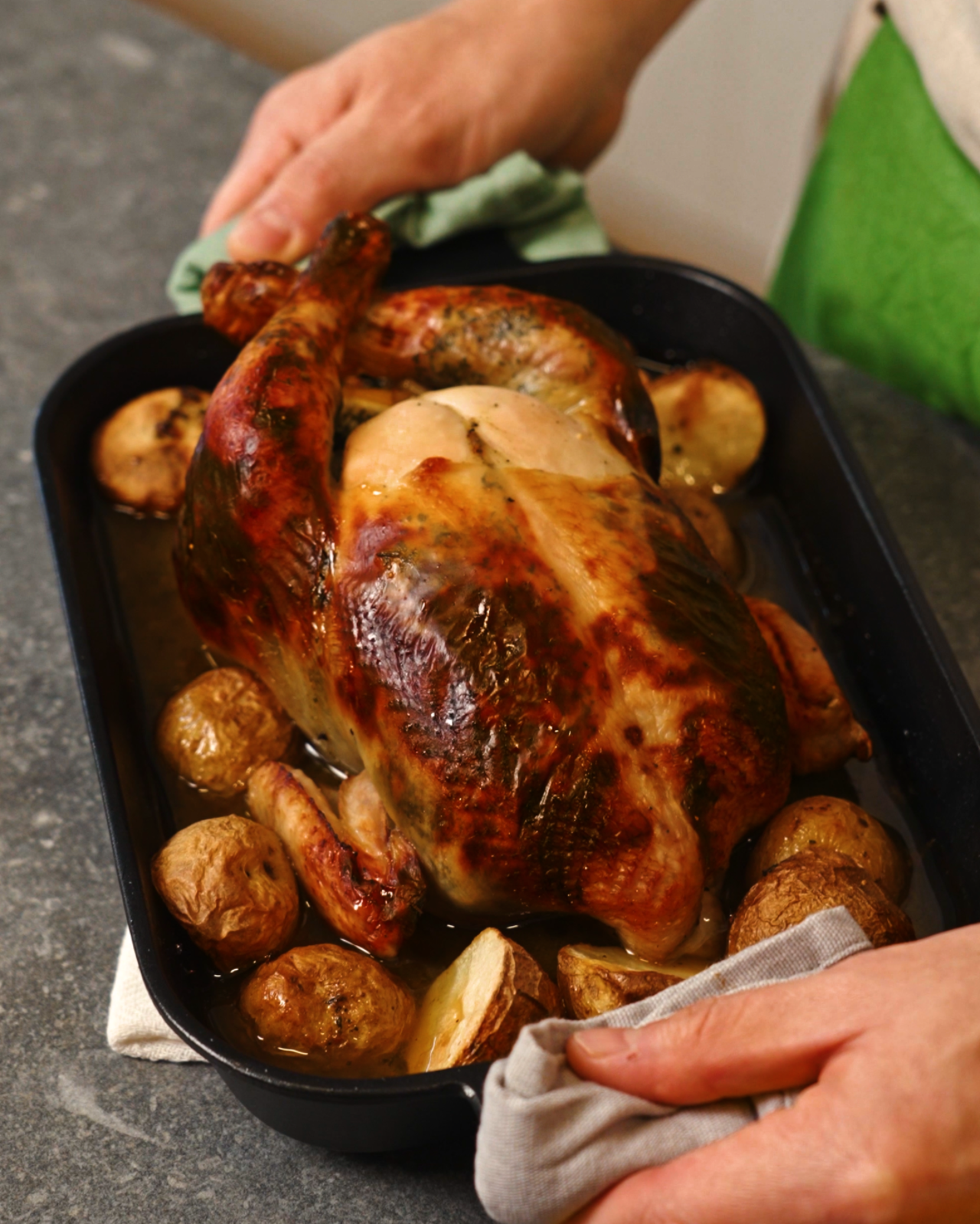 7. 중간쯤 닭을 한번 뒤집어 앞뒤로 노릇하게 로스트 치킨을