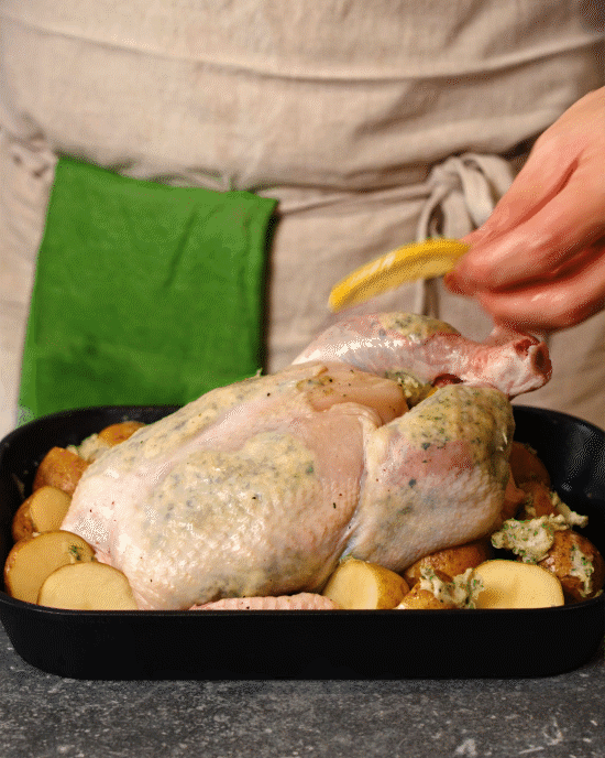 4. 알감자와 닭의 살과 껍질 사이에 허브 버터를 넉넉히