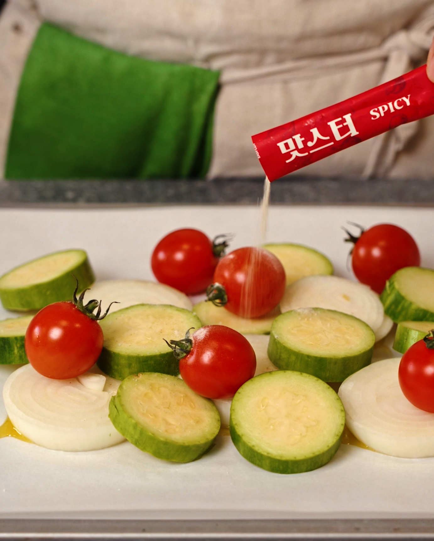 5. 오븐팬에 닭의 가슴살이 위로 향하게 놓고, 알감자와
