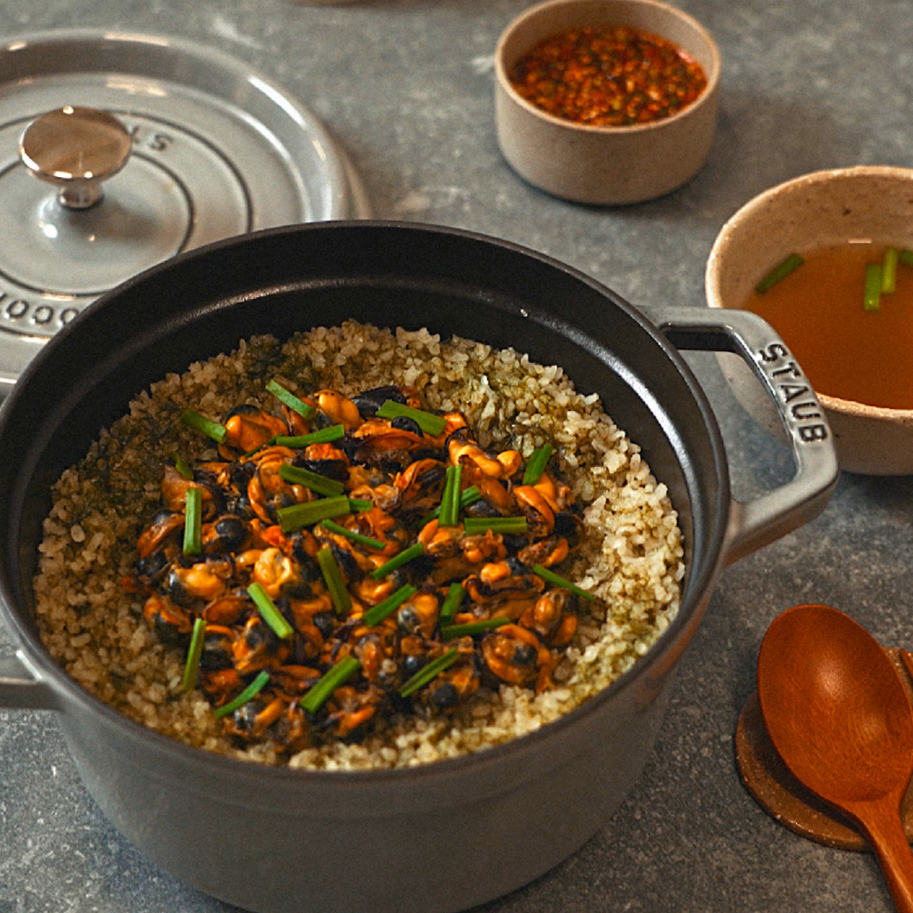 홍합과 매생이는 수분이 많은 식재료에요. 물 양은 쌀 2컵 기준에 1.5컵으로 맞춰주세요.