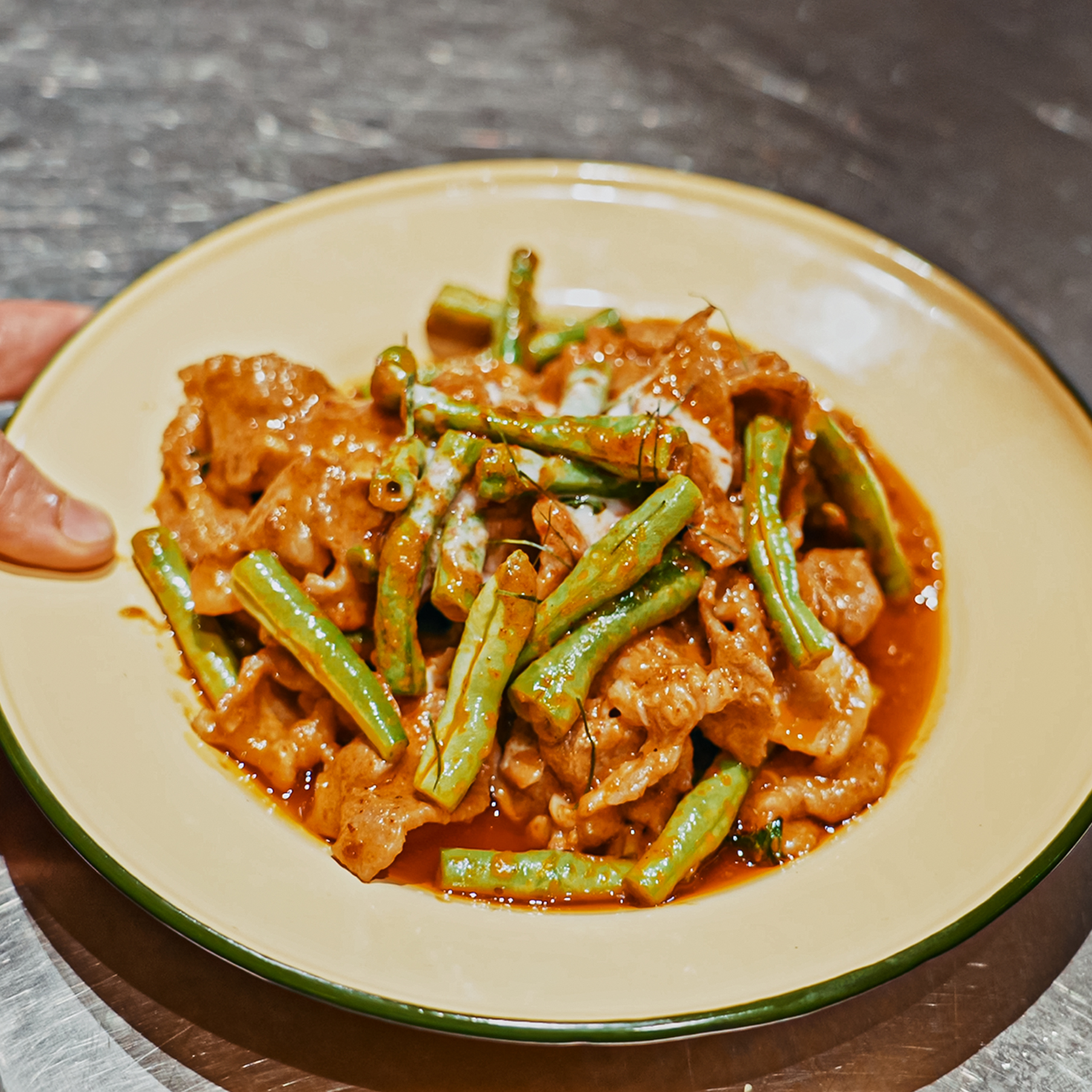 팜슈가(코코넛설탕), 맛스터 스파이시, 롱빈(콩껍질), 타이바질, 카피르라임 잎, 코코넛 크림