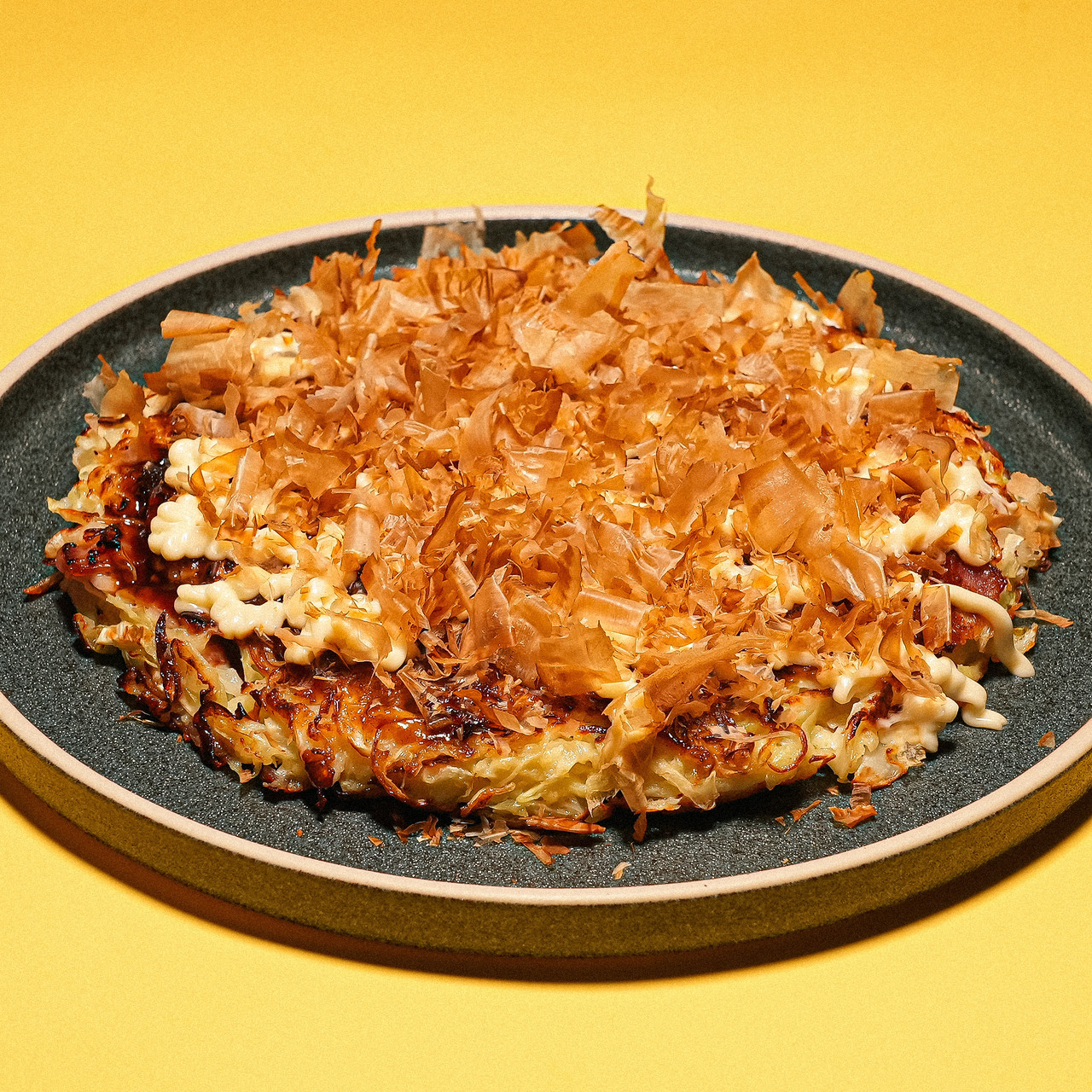 3. 노릇하게 익으면 오꼬노미야끼 소스를 전체적으로 발라주고, 마요네즈와 가쓰오부시를 올려주면 완성!
