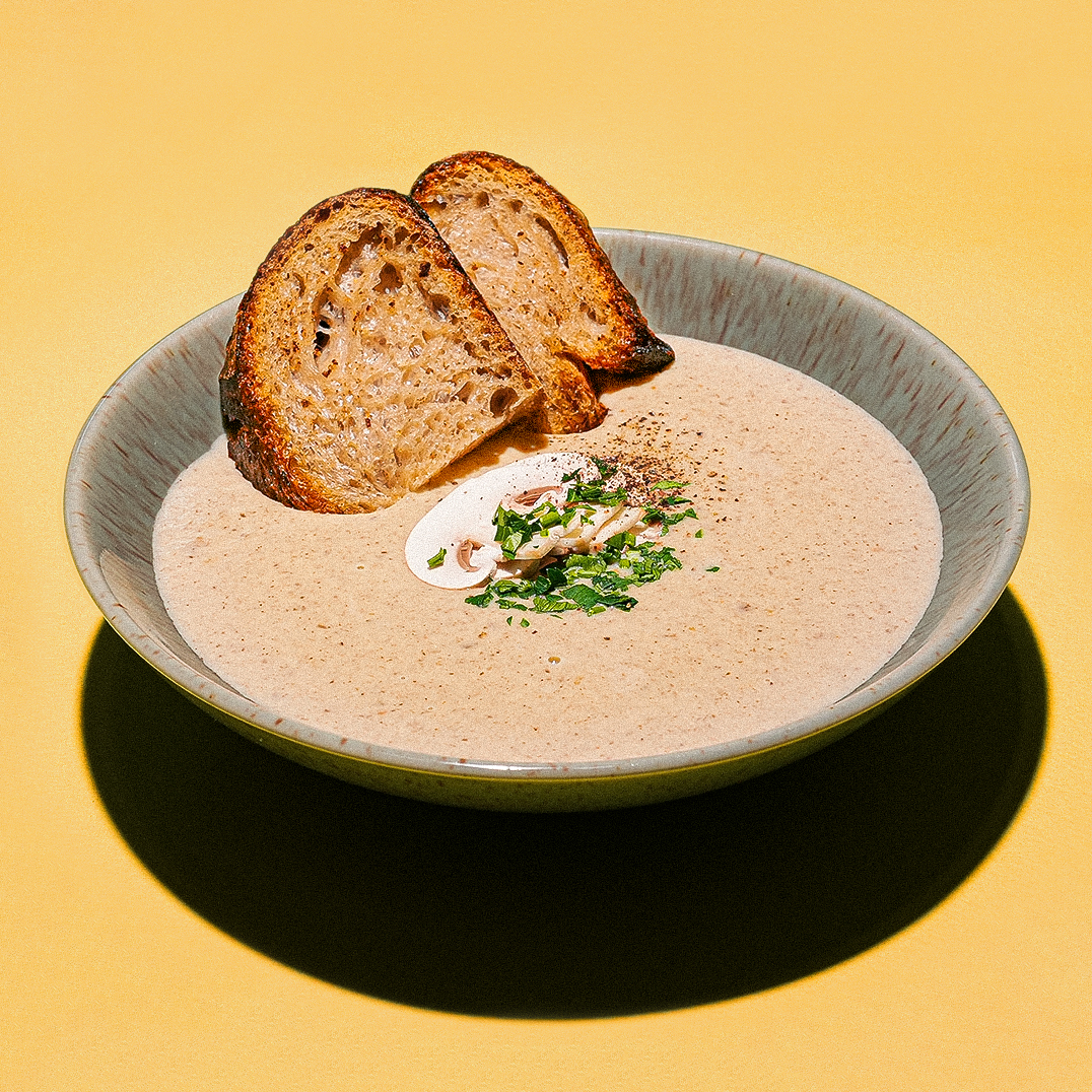 4. 체다치즈로 농도를 잡아주고 토핑용 양송이 버섯과 후추, 이태리 파슬리를 올려주면 완성!