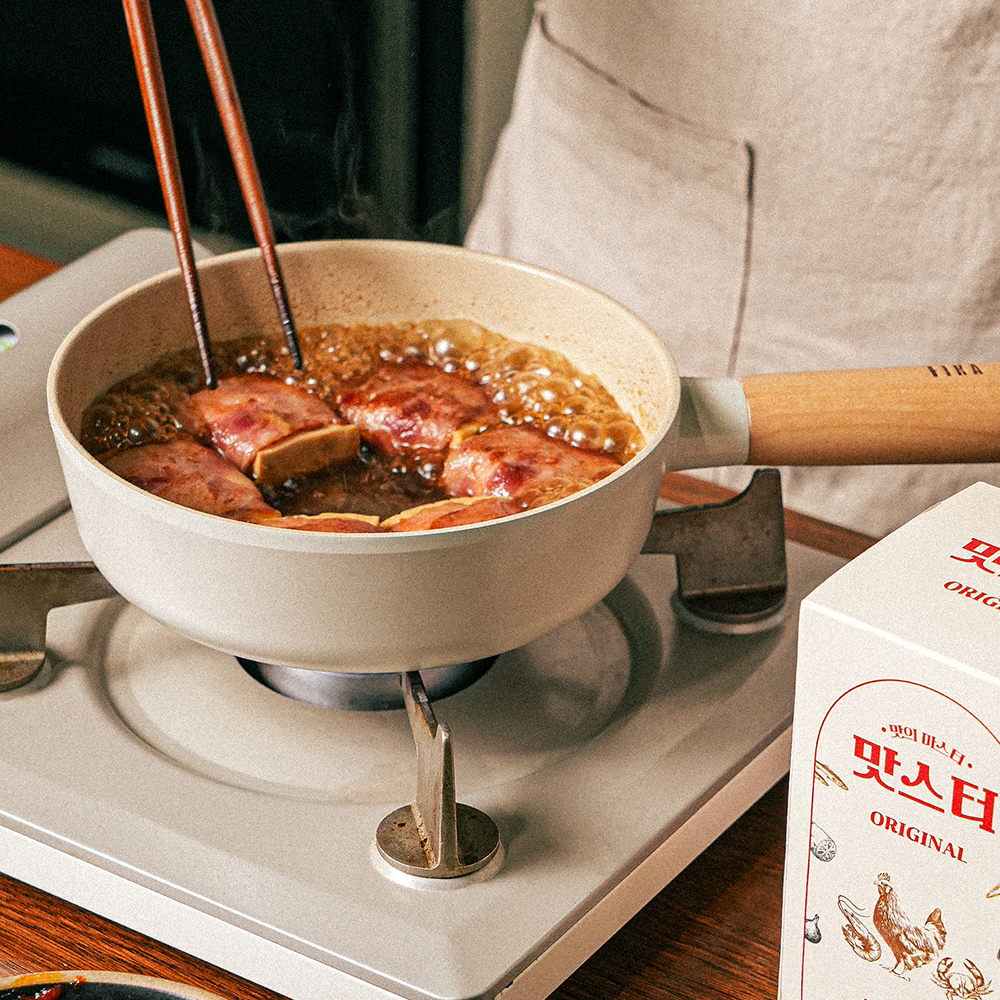 3. 두부는 6등분하여 베이컨을 말아 노릇하게 구워준 뒤 물, 맛스터 오리지널 1포, 진간장, 설탕을 넣어 졸여주세요.