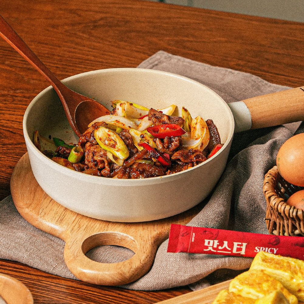 맛스터 스파이시 1포, 진간장 1.5T, 설탕 1T, 고춧가루 2T, 물 2T, 식용유 1.5T, 후추, 참깨