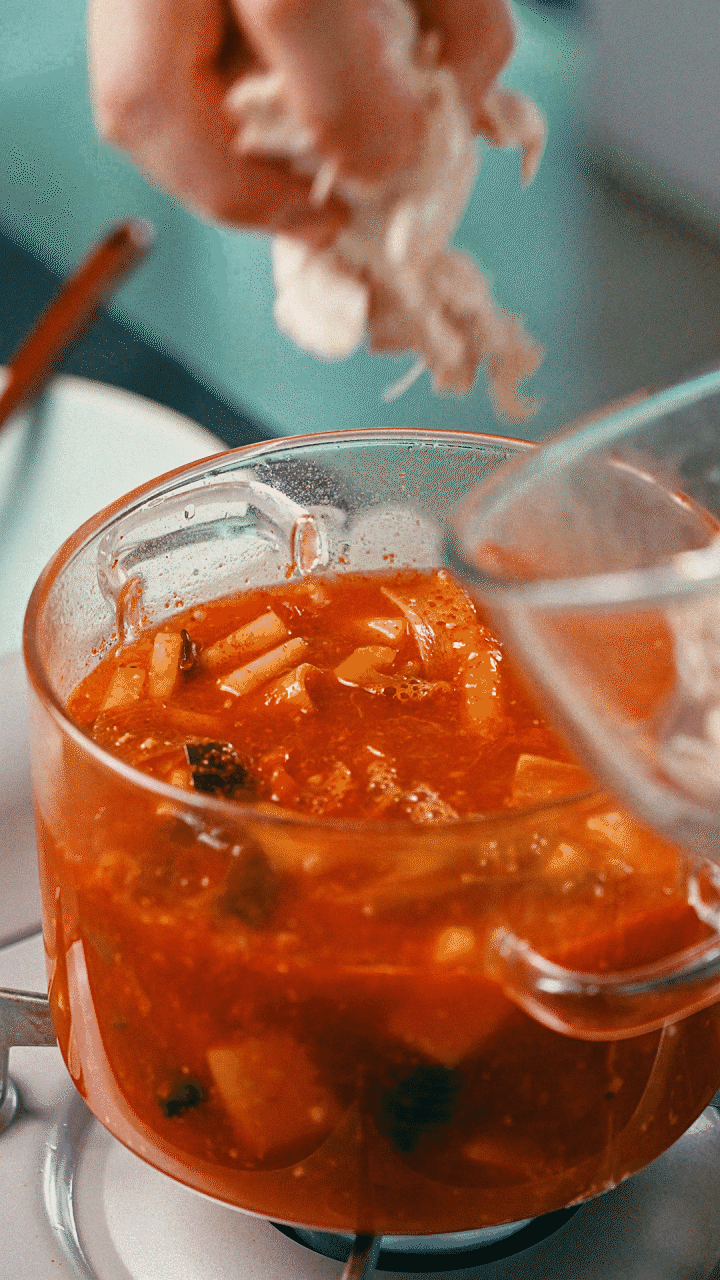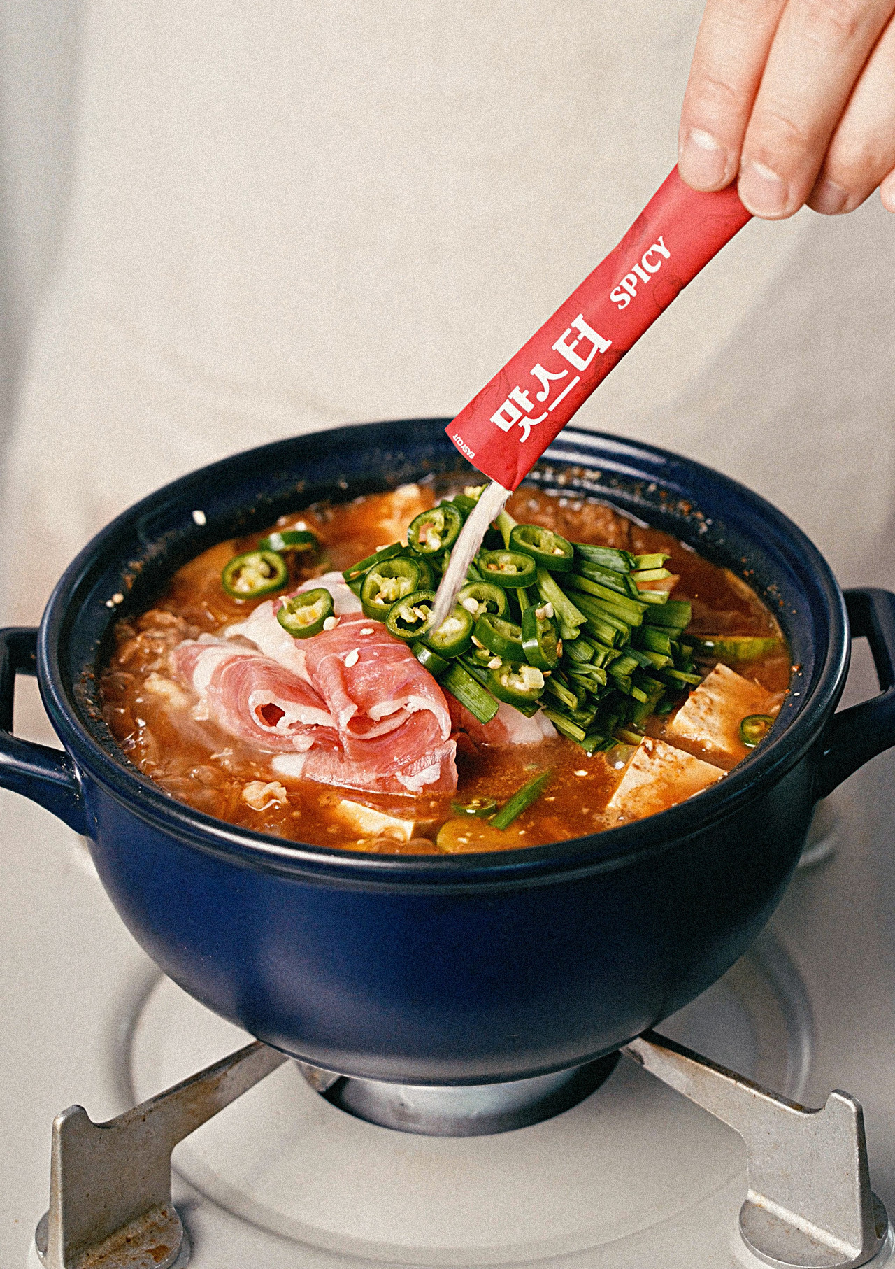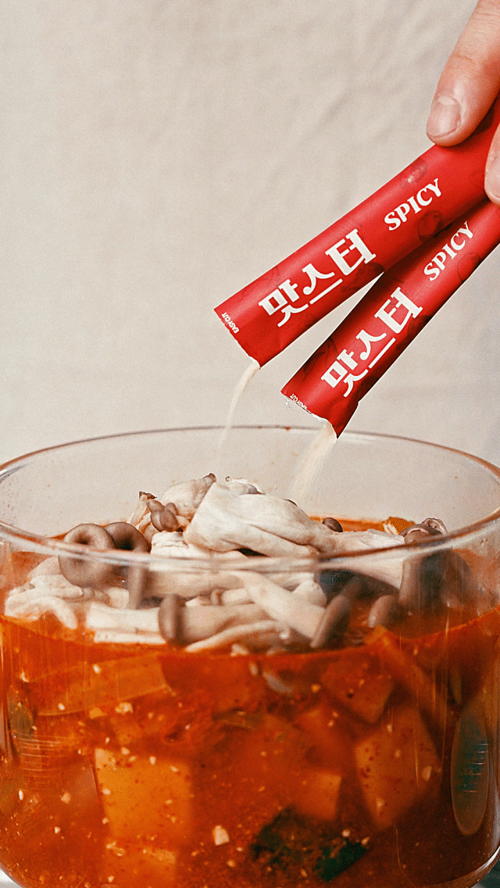 3. 구수한 향이 올라오면 물을 붓고 맛스터 스파이시 1포를