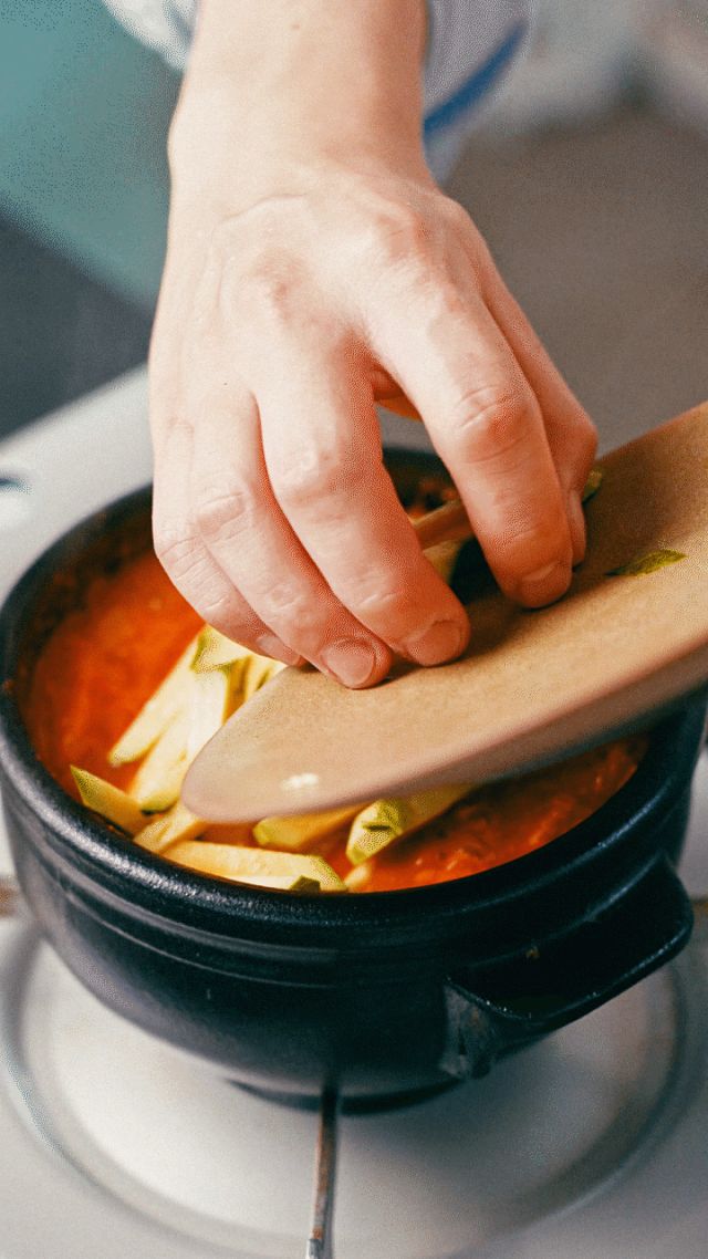 4. 찌개가 끓기 시작하면 양파와 감자, 애호박을 넣고 함께