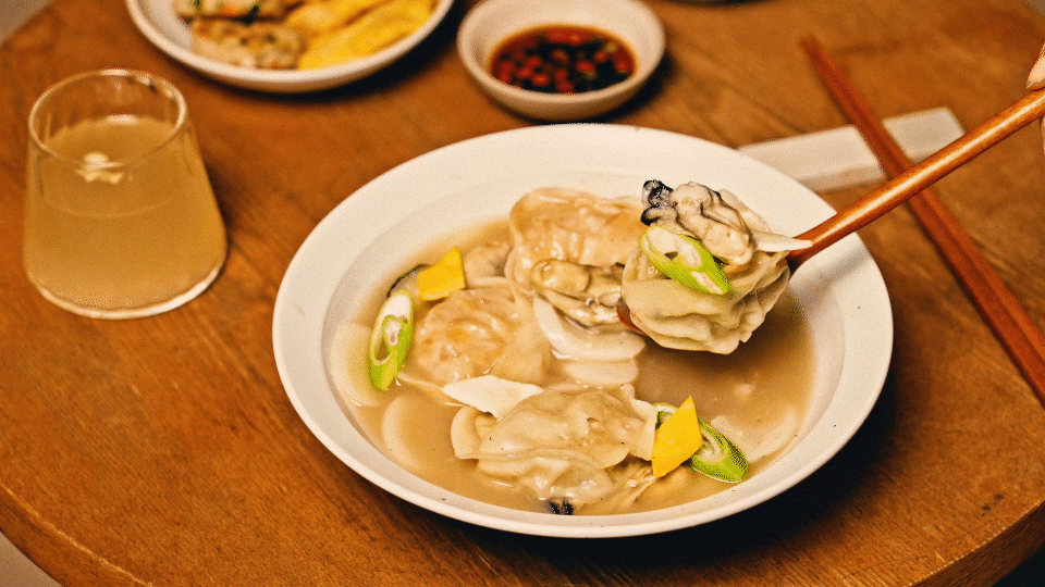 떡국떡과 손 만두를 넣어 끓인 굴 떡만둣국이에요.