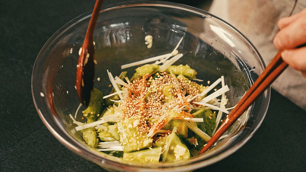 3. 오이와 대파를 양념장에 버무려주고, 마지막으로 참깨와 고추기름을 둘러 마무리해주세요.