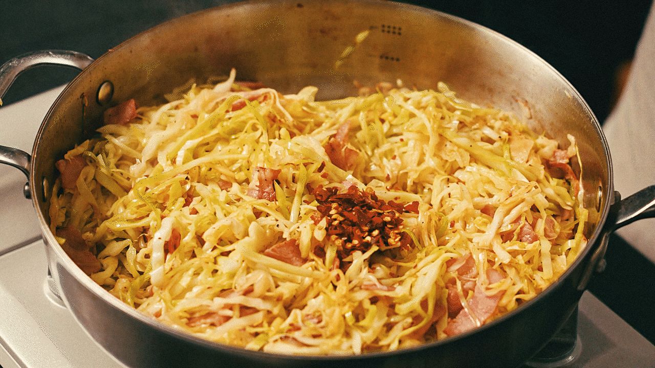 따뜻하게 볶은 양배추 베이컨 볶음은 밥 위에 올려