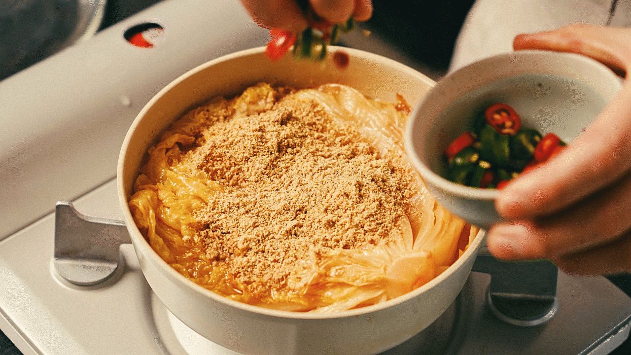 4. 묵은지가 부드럽게 익고 채수가 자작해지면 청ㆍ홍고추와 들깨가루를 뿌려 3분간 더 끓여주면 완성!