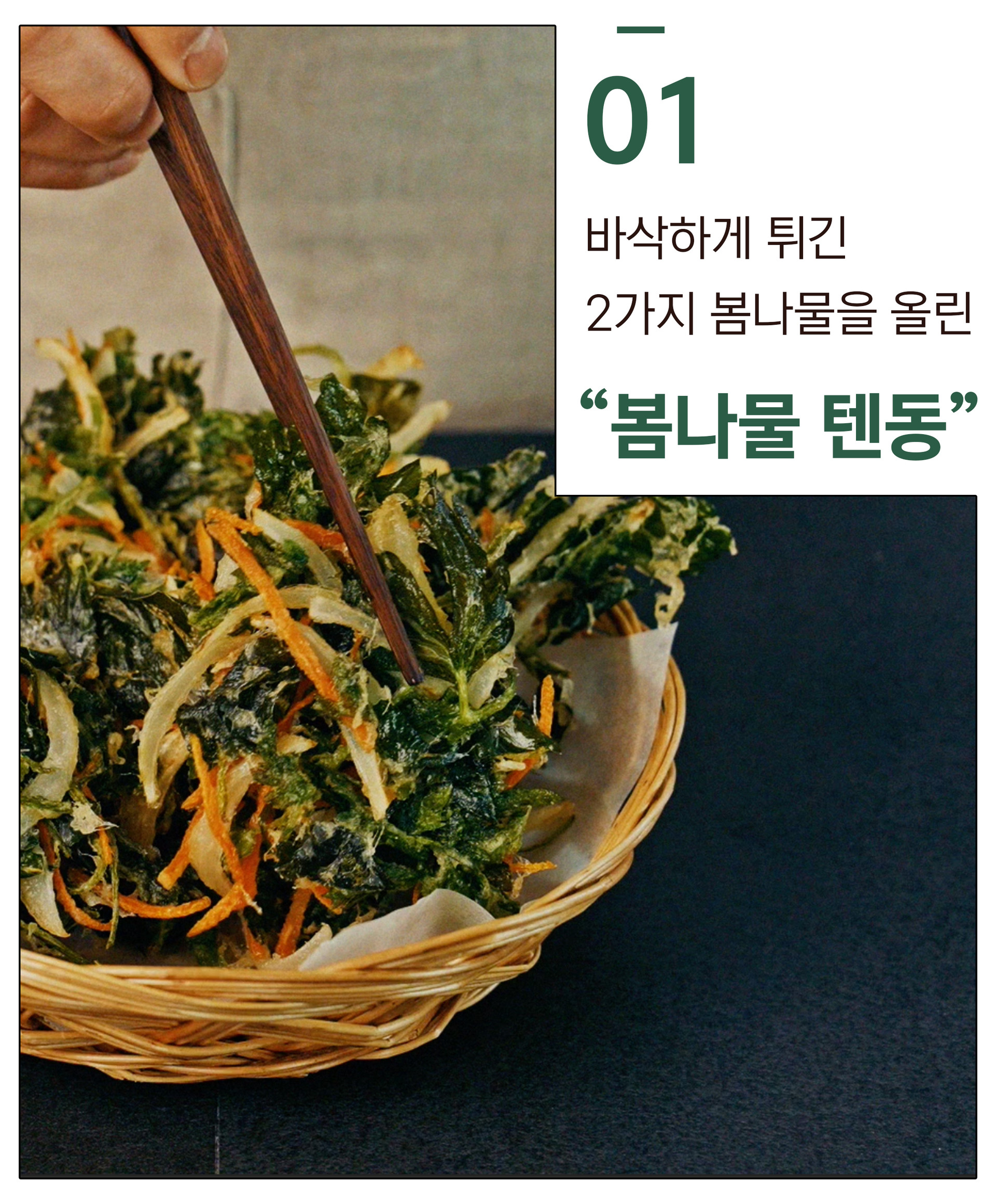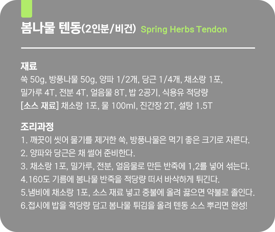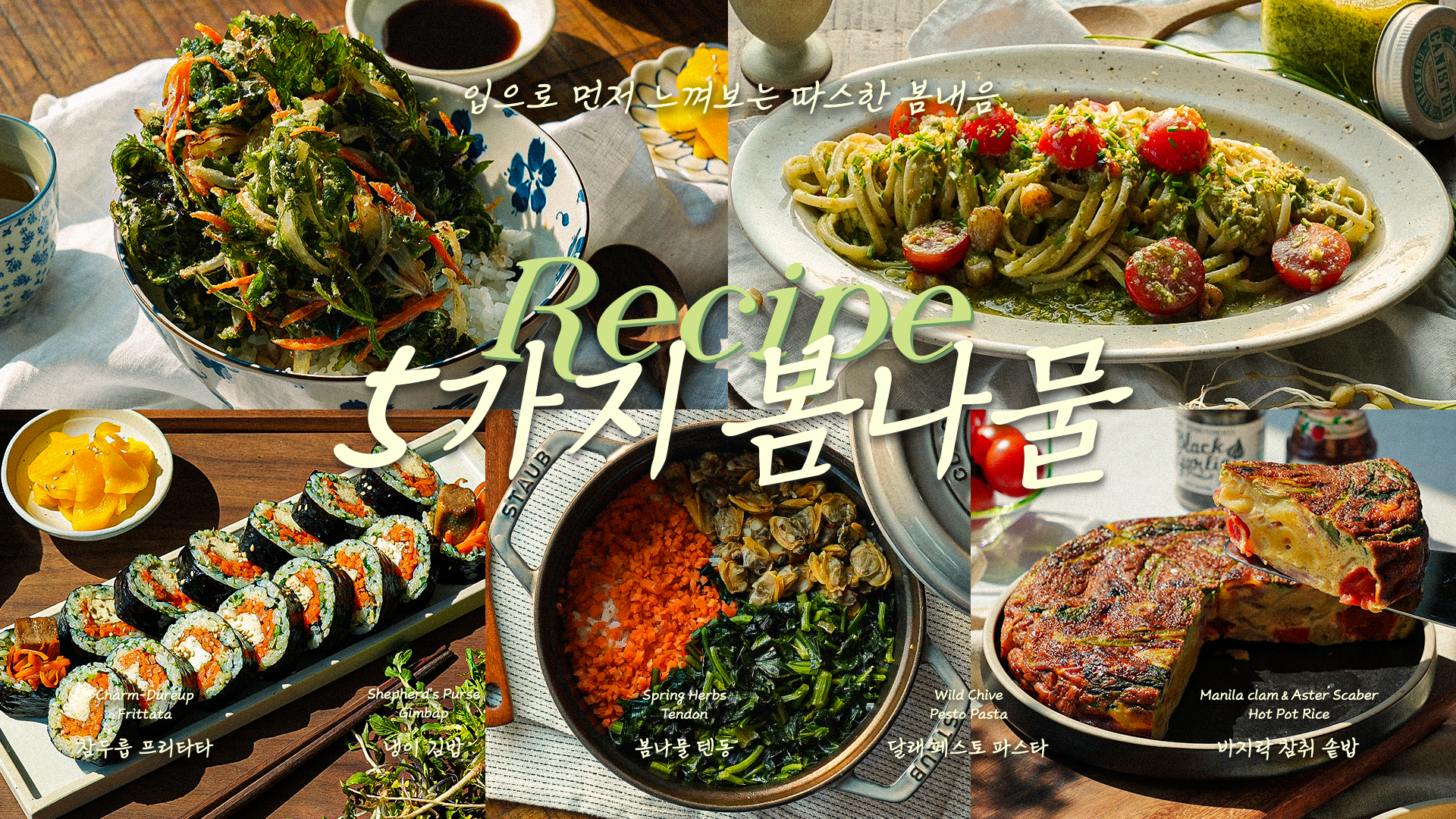 봄나물 텐동 ㅣ 냉이 김밥 ㅣ 두릅 프리타타 ㅣ 바지락 참취 솥밥 ㅣ 달래 페스토 파스타