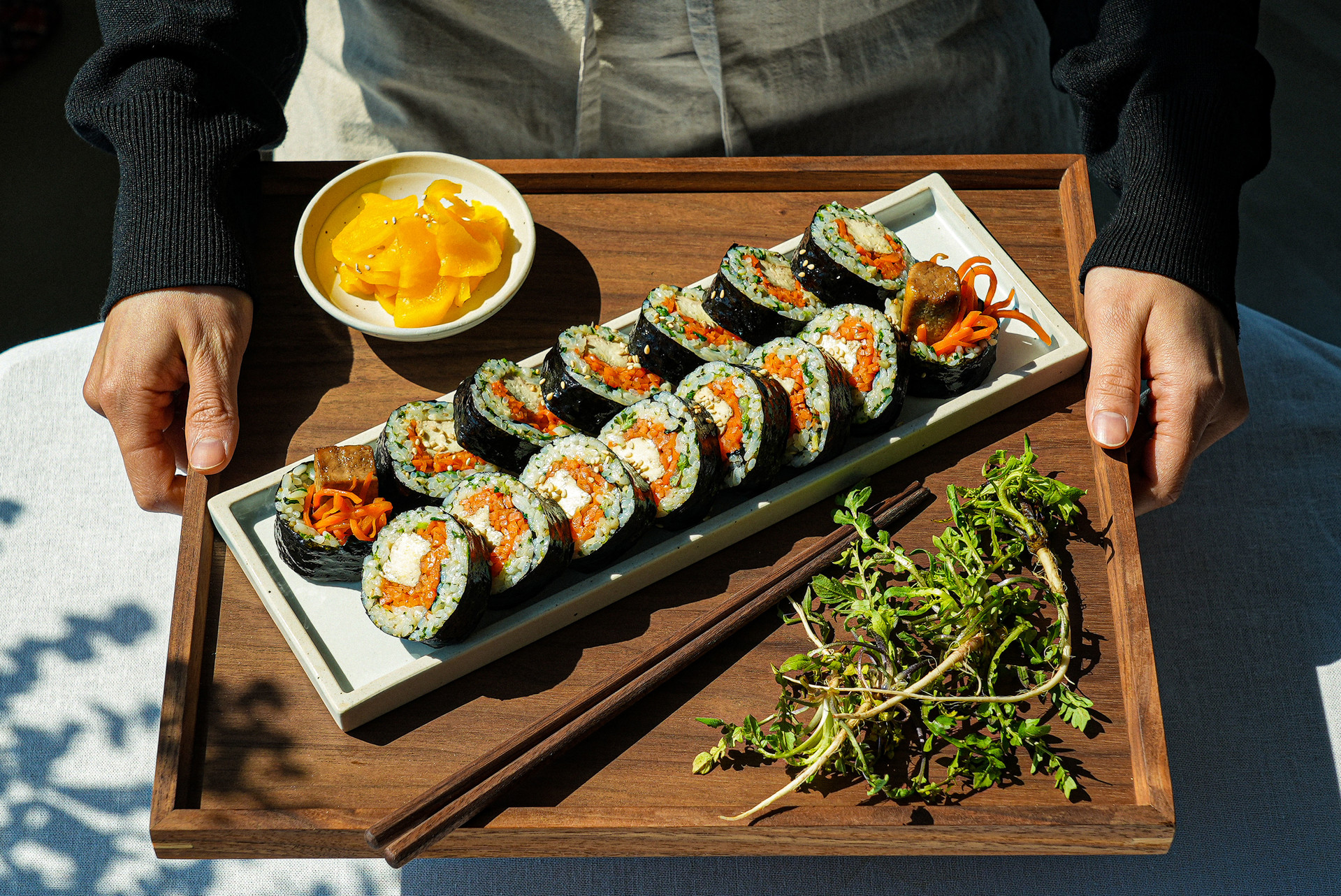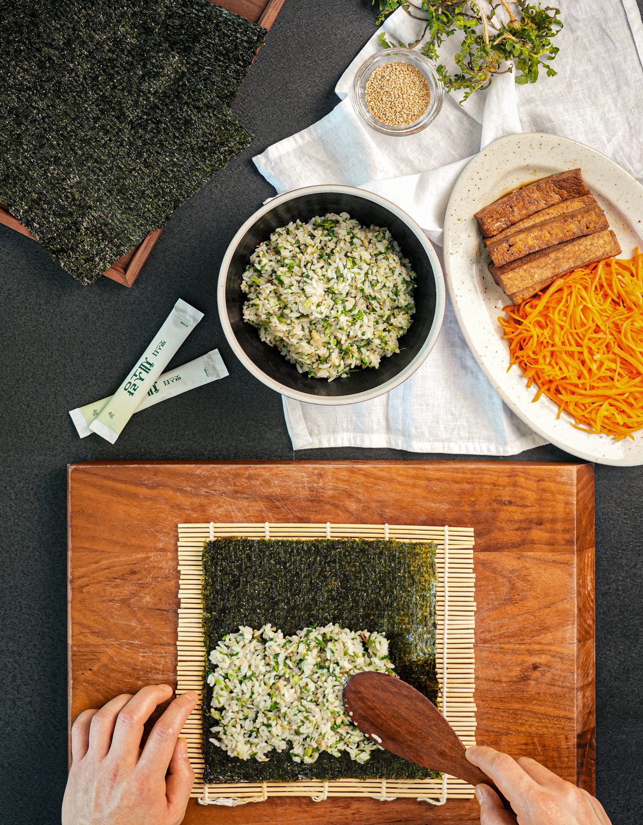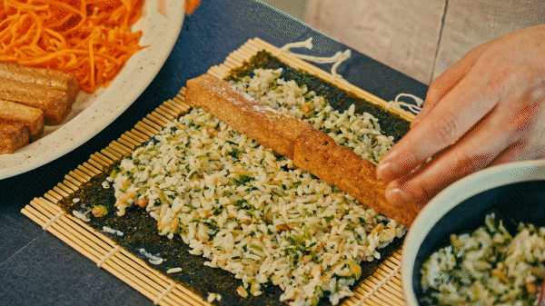 5. 김발에 김을 깔고 4를 고르게 편 뒤, 두부와 당근채를