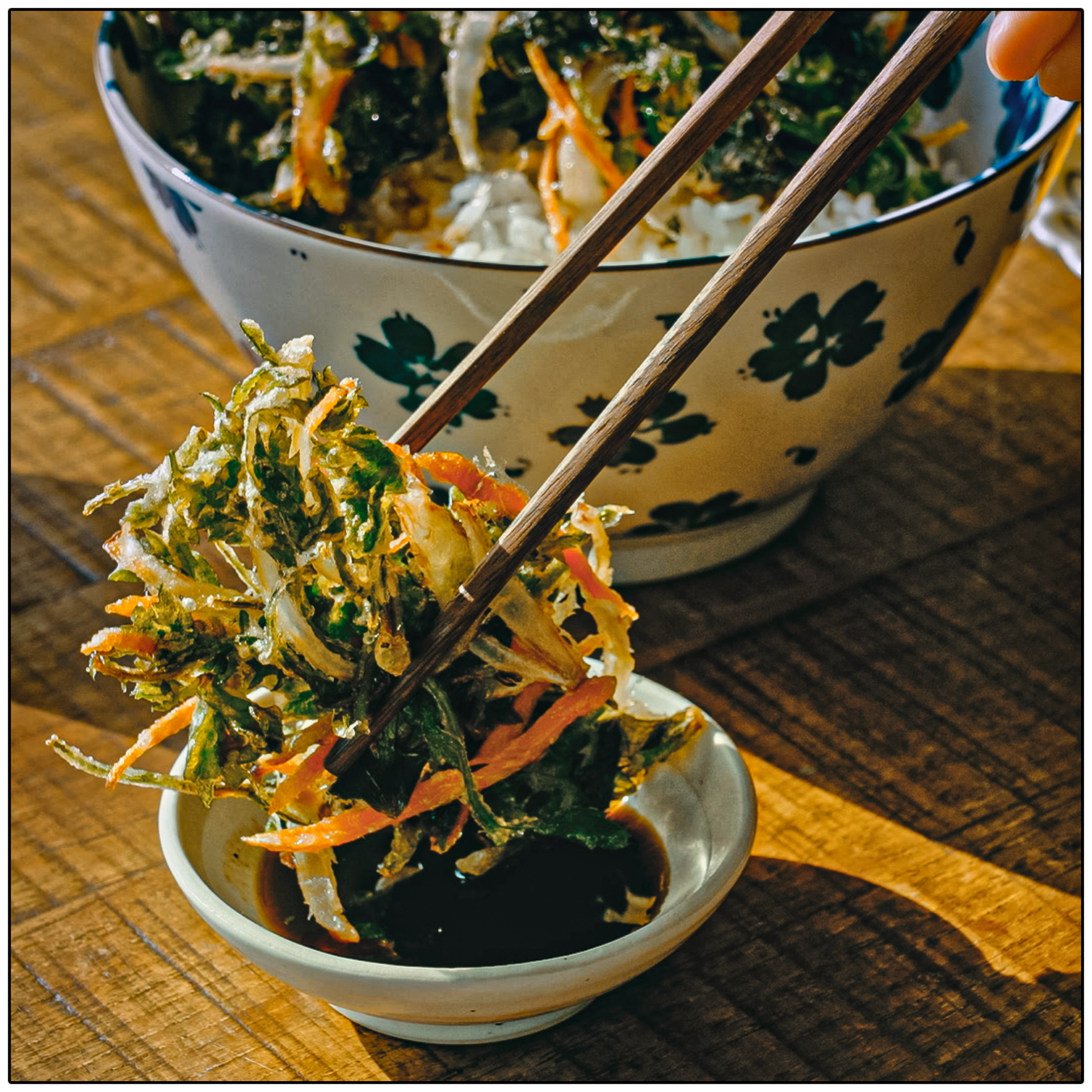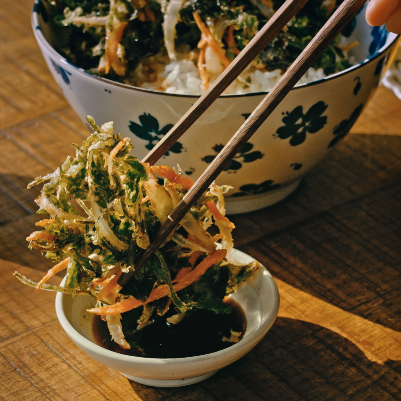 따뜻한 밥 위에 봄나물 튀김을 올리고,