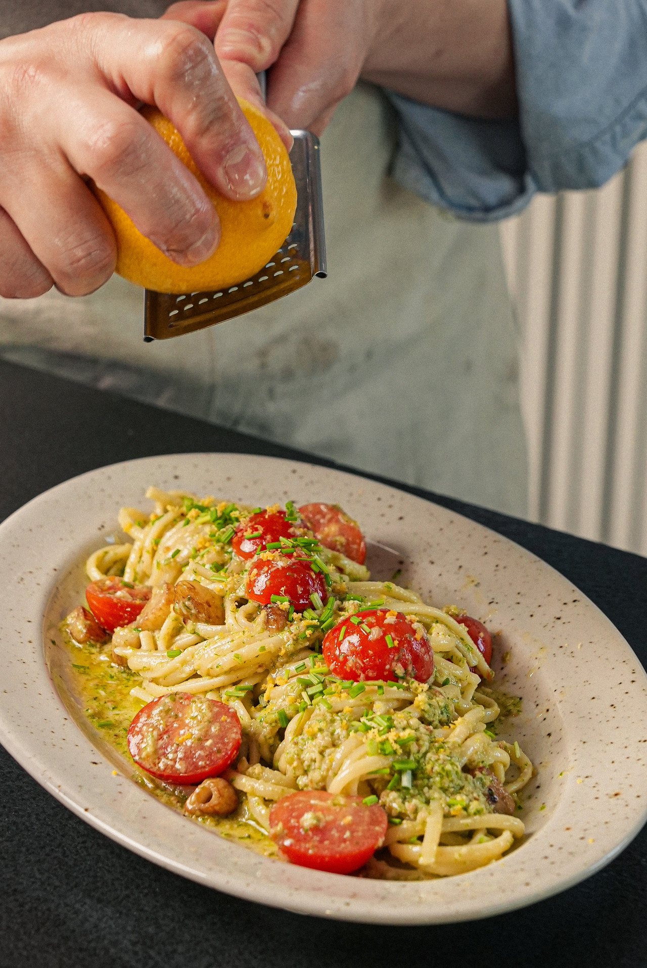 6. 접시에 파스타 담고 레몬 제스트와 달래잎을 뿌려 완성!