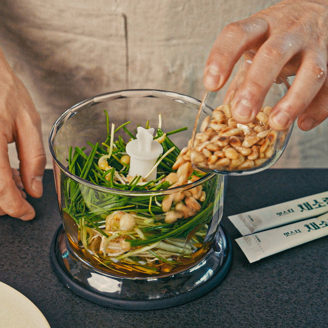 1. 손질한 달래는 채소랑 2포, 페스토 재료 함께 갈아준다.