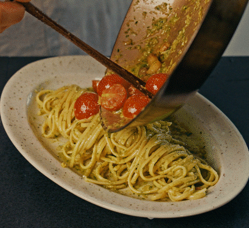 불을 끄고 달래 페스토와 방울토마토를 넣고 잘 섞어준다.